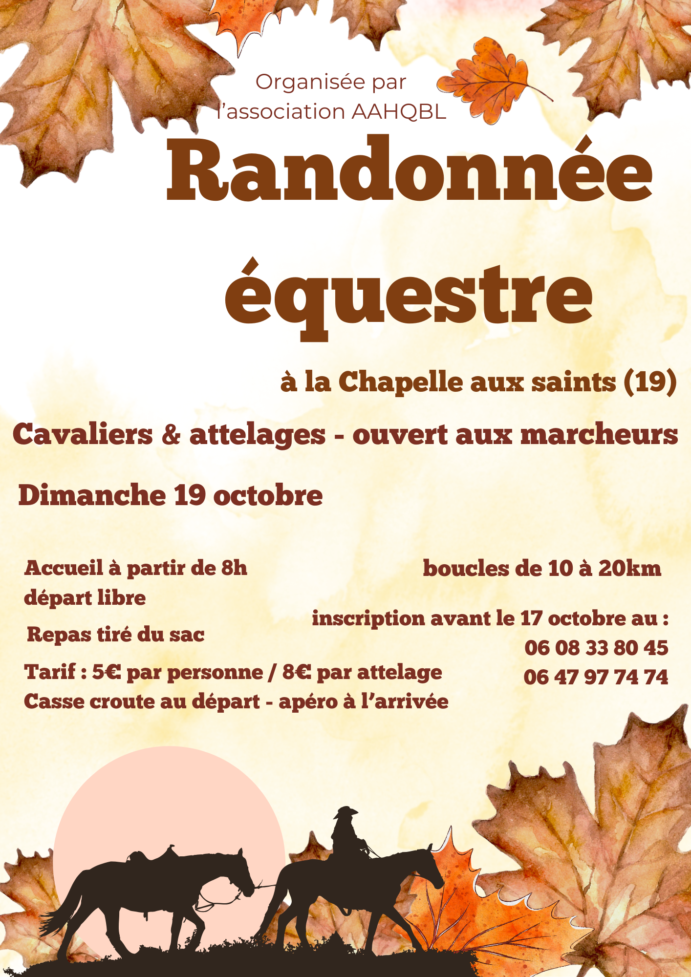 L'association organise le dimanche 19 octobre une randonnée ouverte aux cavaliers, meneurs pédestres et VTT à la Chapelle aux Saints chez Madame Alicja BOYER.